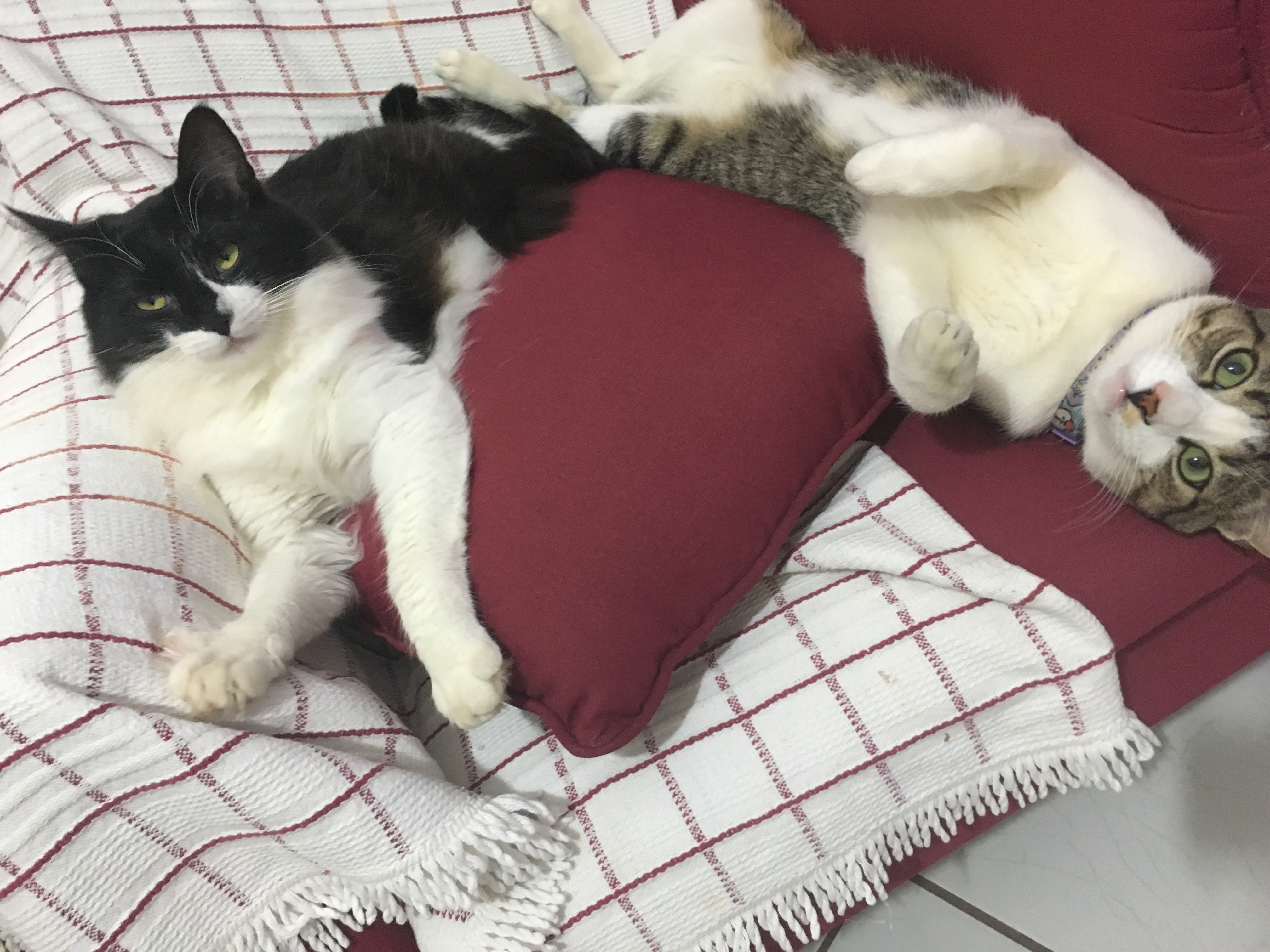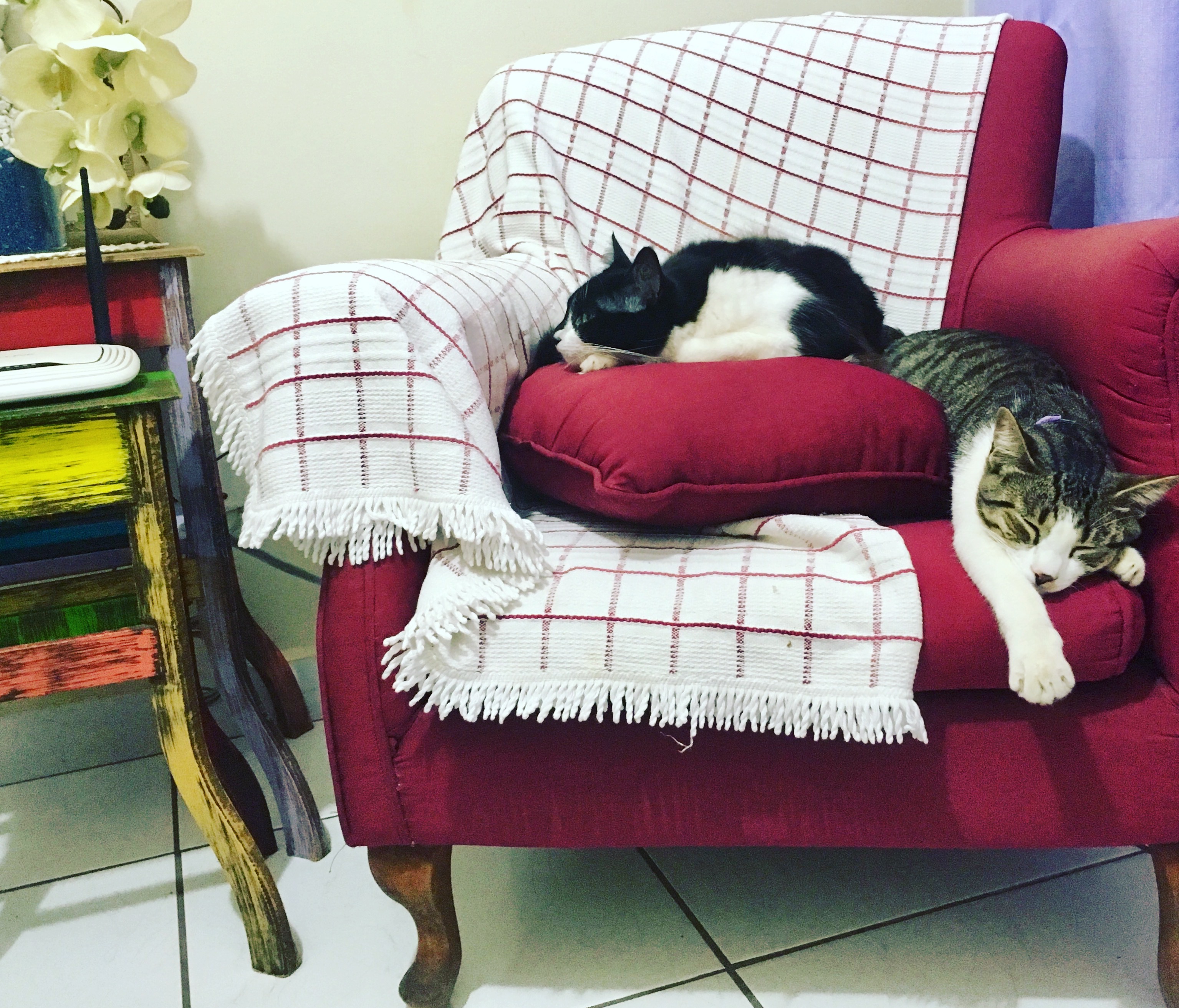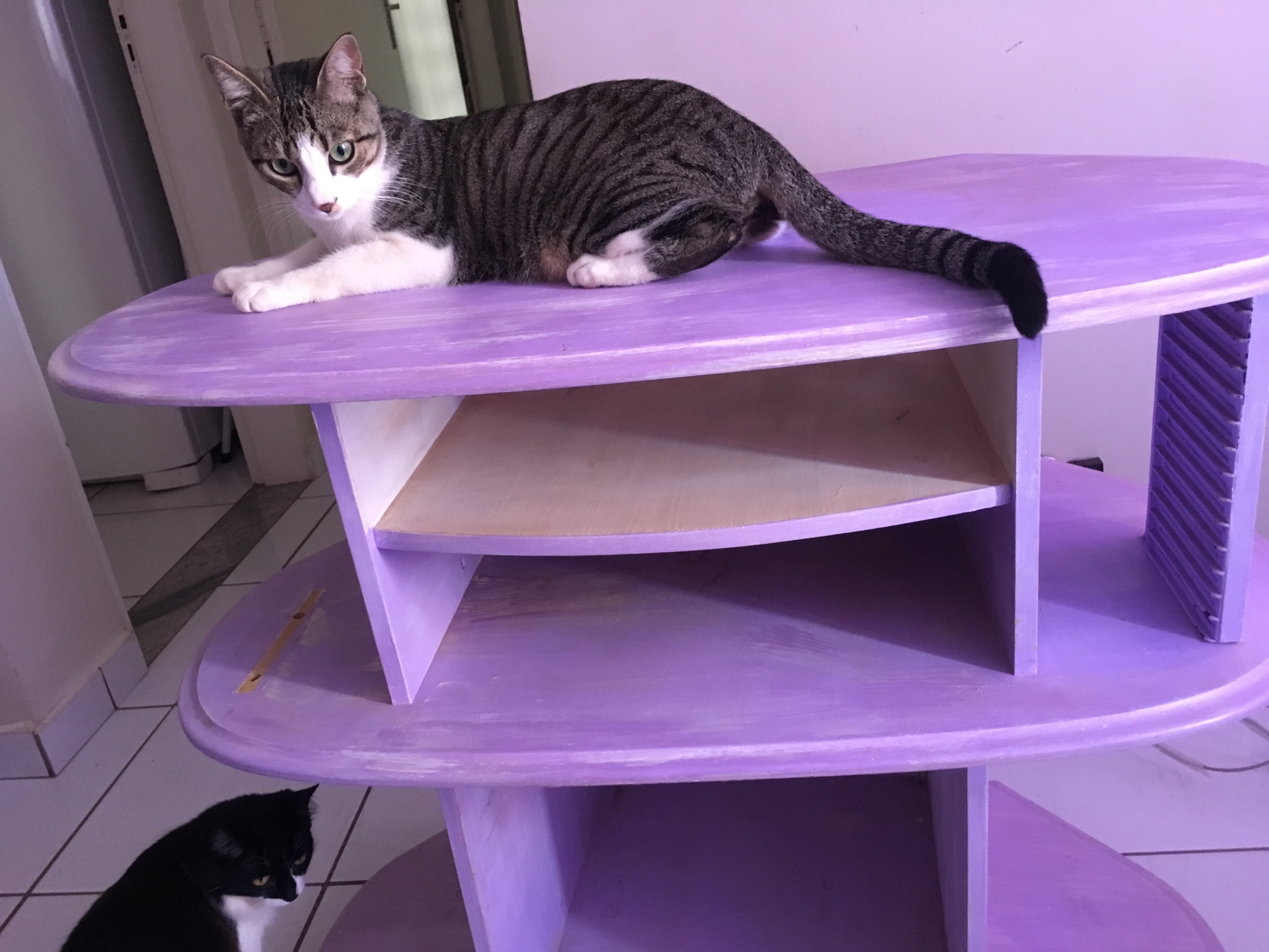 Após uma semana, já se alimentavam lado a lado e compartilhavam sonecas no mesmo cômodo. Logo passariam a dormir lado a lado também sobre sofás, camas e no arranhador caseiro – um no topo, outro na redinha de baixo – que montei a partir de um banco de madeira, tapetes e cordas.