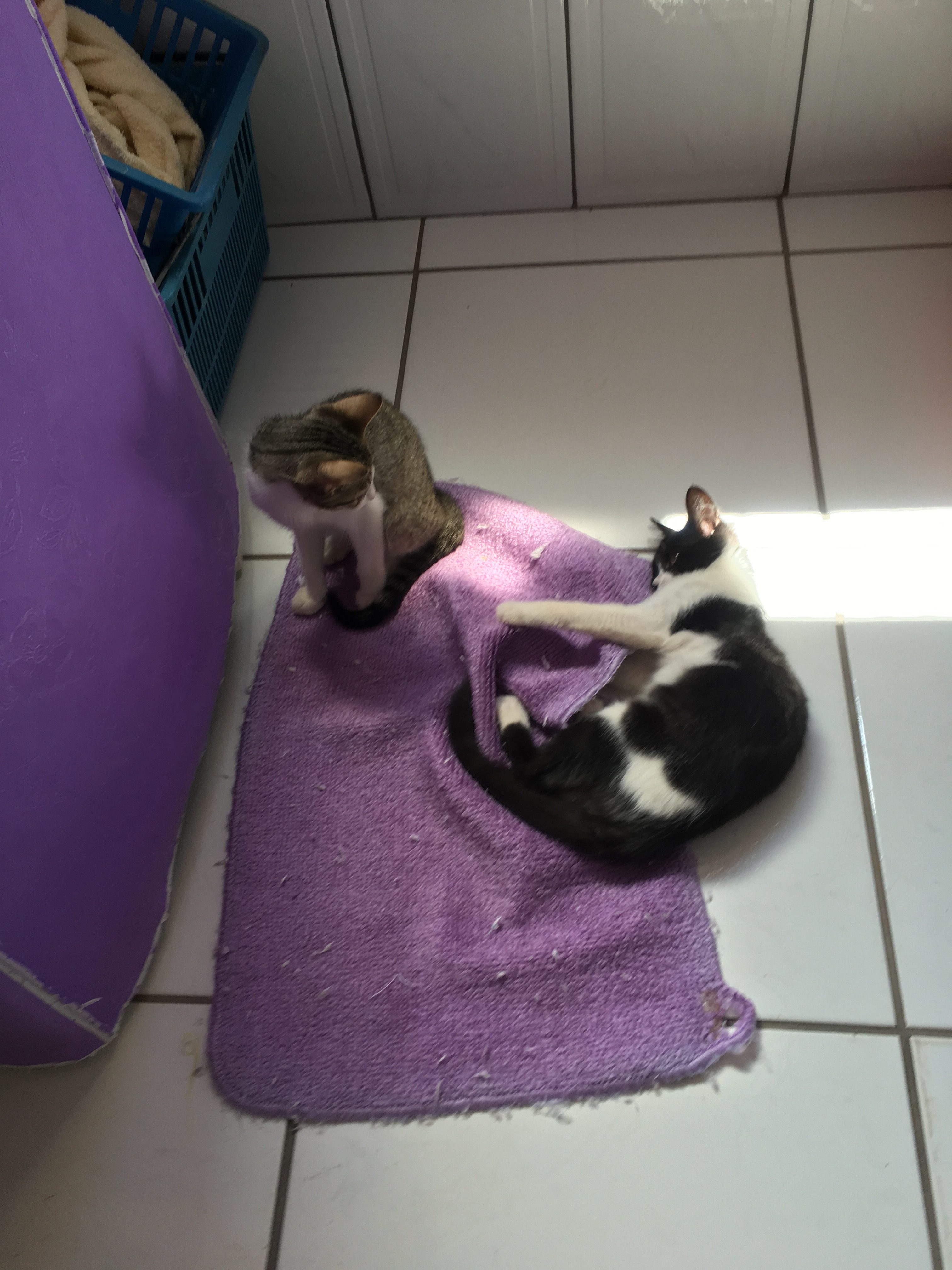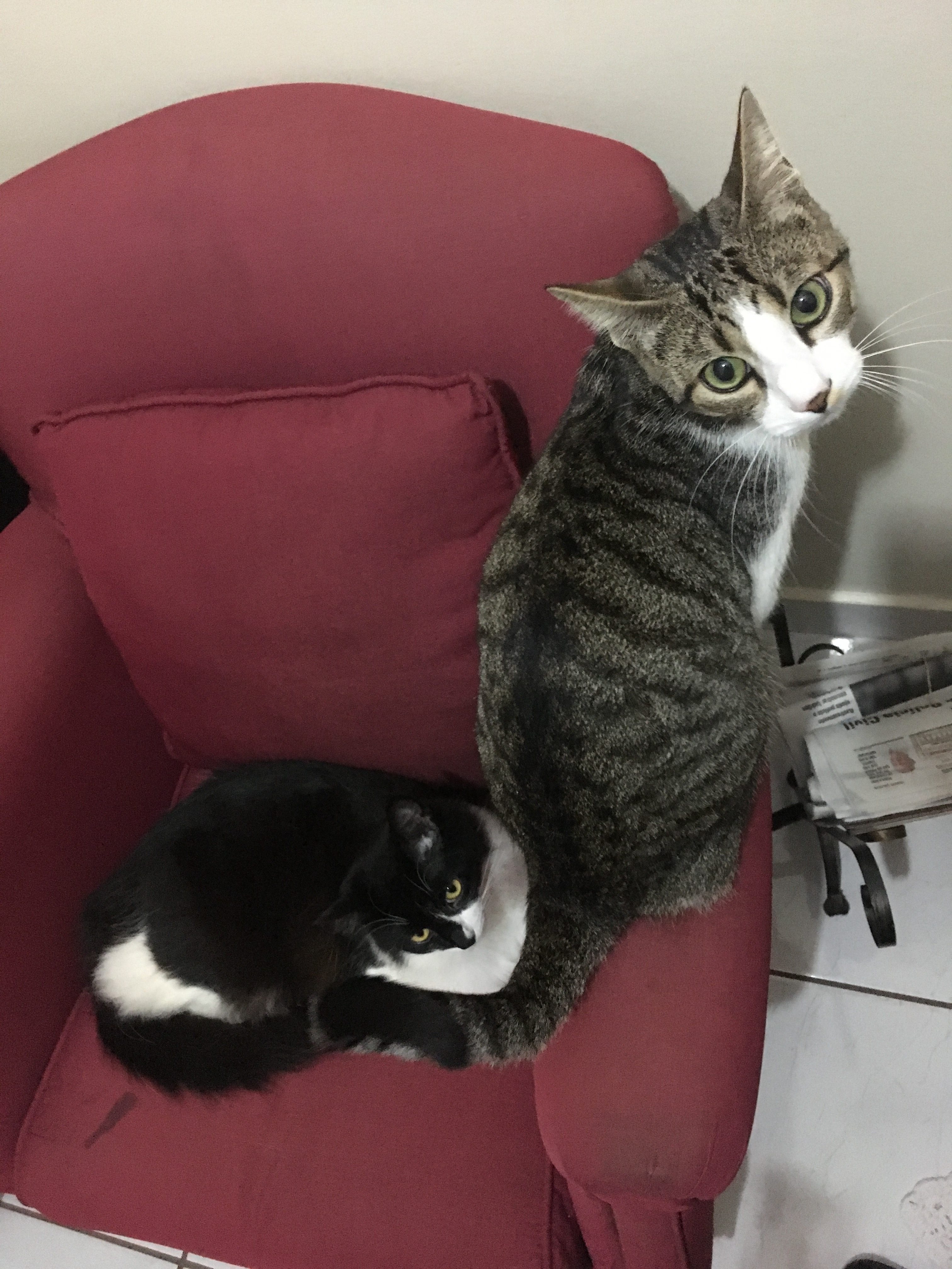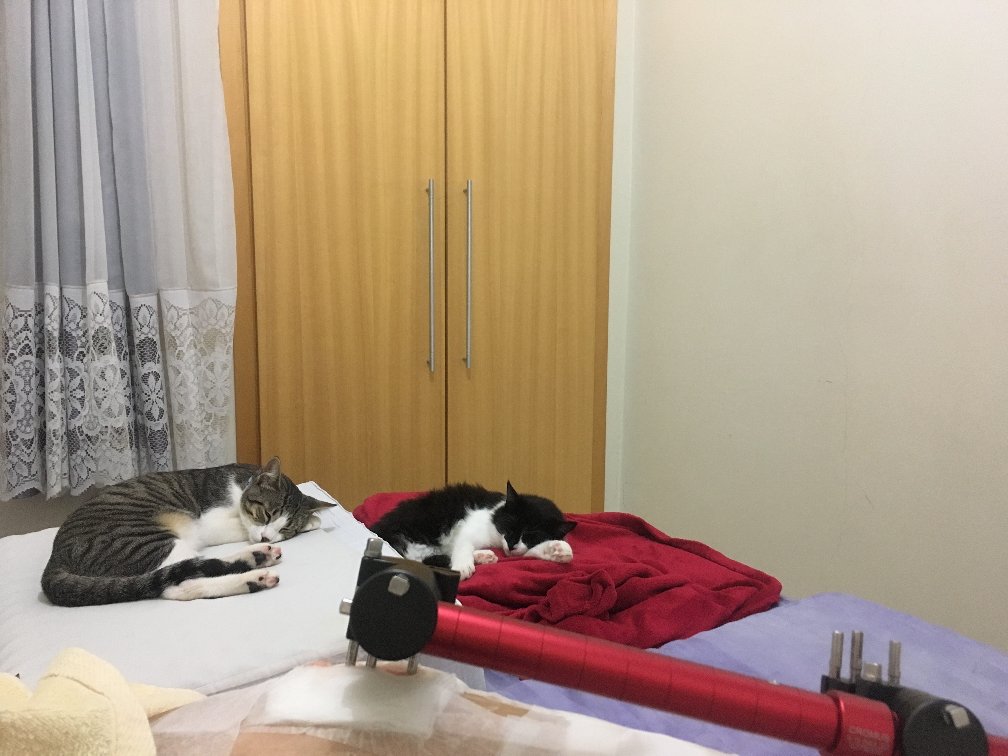 Após uma semana, já se alimentavam lado a lado e compartilhavam sonecas no mesmo cômodo. Logo passariam a dormir lado a lado também sobre sofás, camas e no arranhador caseiro – um no topo, outro na redinha de baixo – que montei a partir de um banco de madeira, tapetes e cordas.